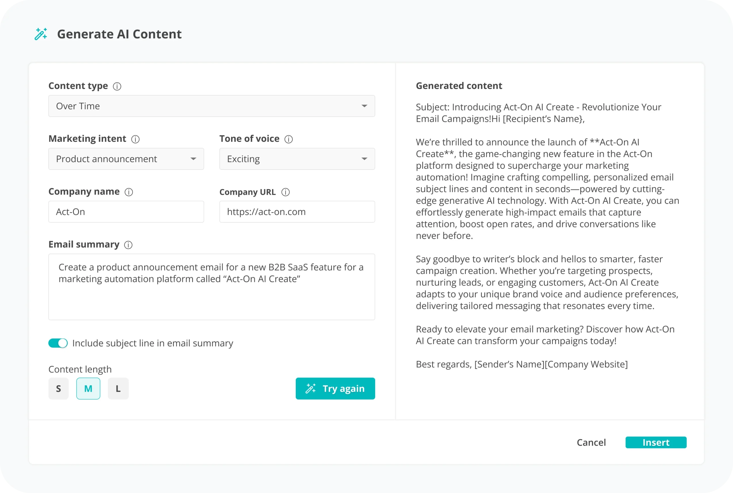 Accelerate your content creation with the Act-On AI Create, our generative AI content creation feature. End writer’s block and accelerate efforts to ideate, create, and perfect the most compelling and engaging email content and subject lines without leaving the Act-On platform. We leverage OpenAI’s powerful LLM to generate compelling content, and our own prompts engine to make it easy for you to create the right personalization and tone, and then with the push of a button, populate your emails and campaigns.