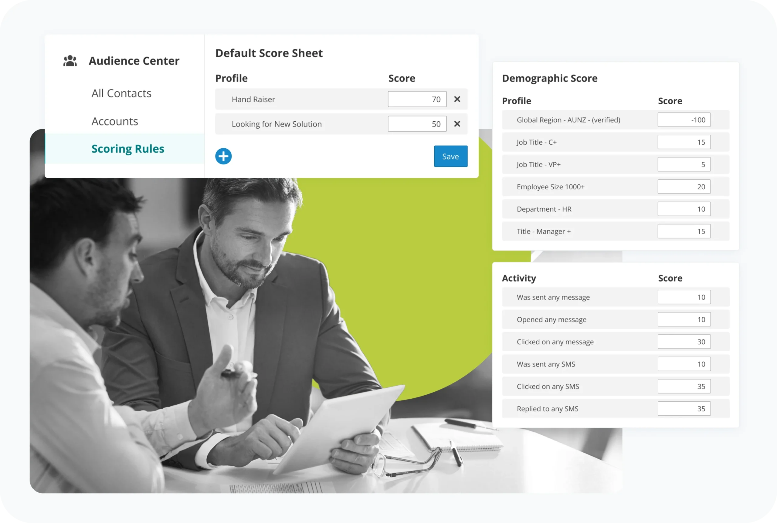 Develop lead scoring models to understand prospects’ intentions based on demographics, firmographics, and behavior. Track and score prospects based on engagement activity such as website visits, content views, form-fills, email opens, webinar attendance, social media reply, content syndication download and many more. Develop multiple models to represent new leads vs. customer engagement.