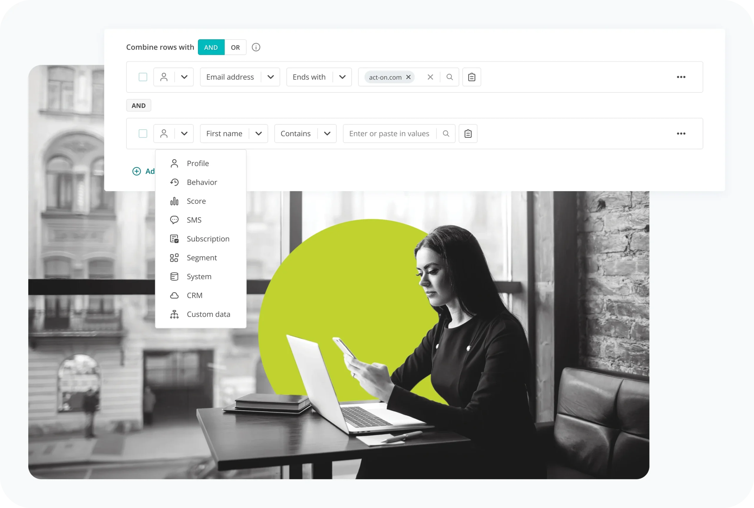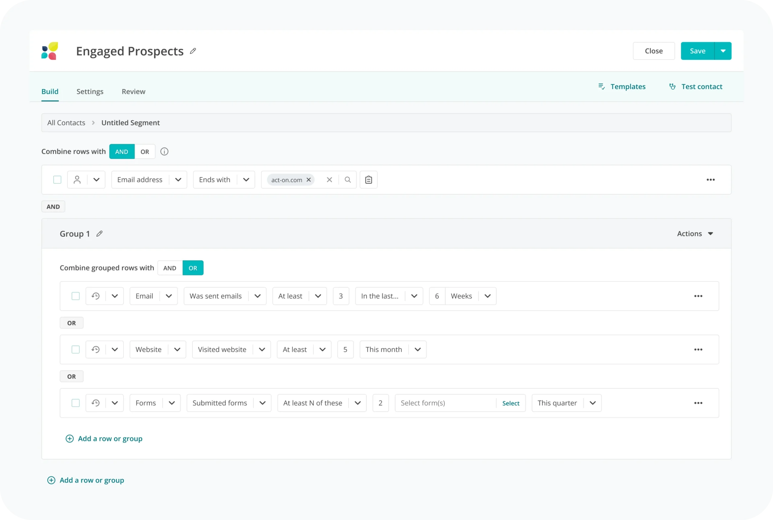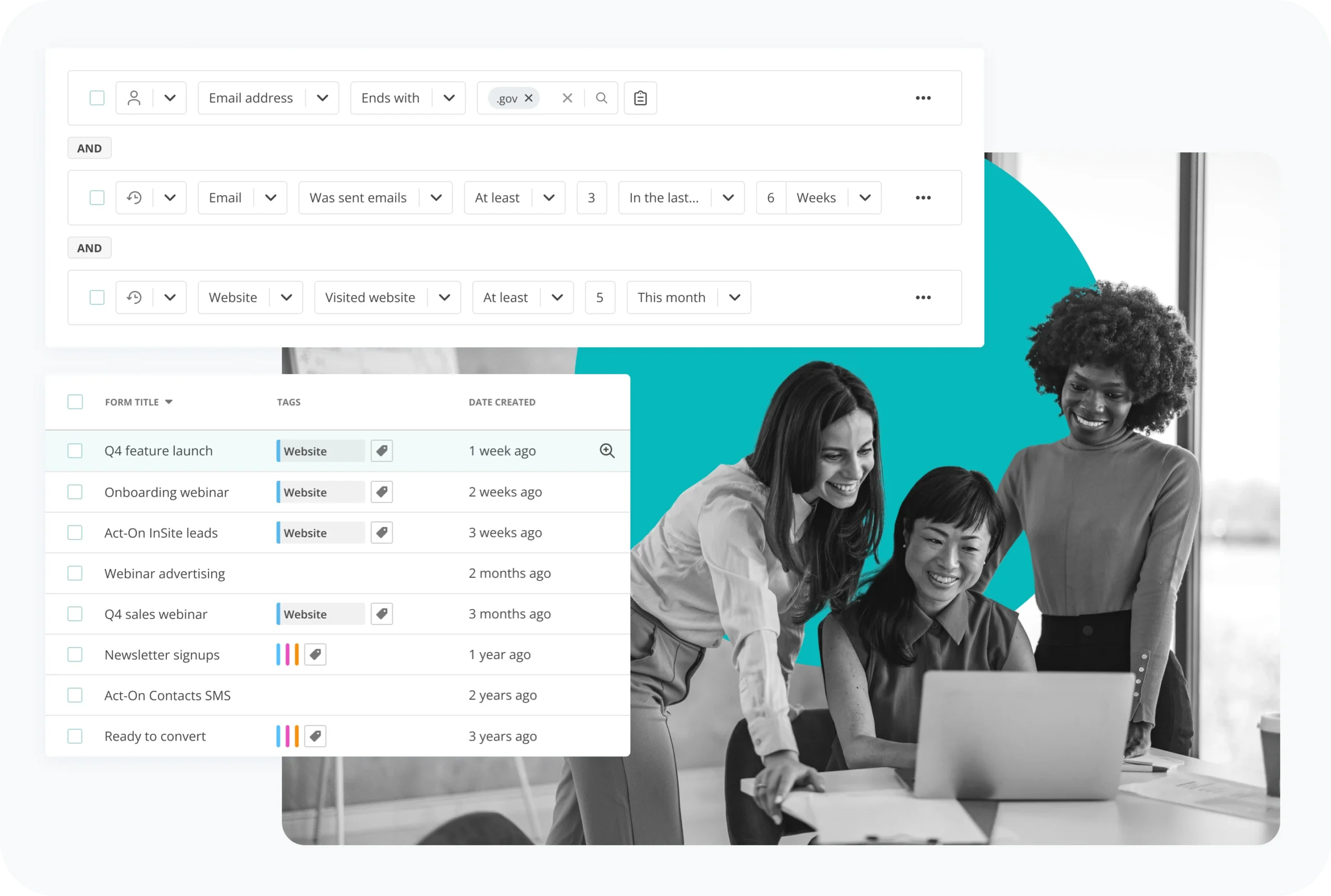 Demographic segmentation helps you drill down to the individual profile level with buyer attributes such as age, gender, education, and income. Advanced segmentation delivered through Act-On leads to more empathetic marketing, which helps you build and strengthen brand loyalty while iterating and improving your marketing programs.