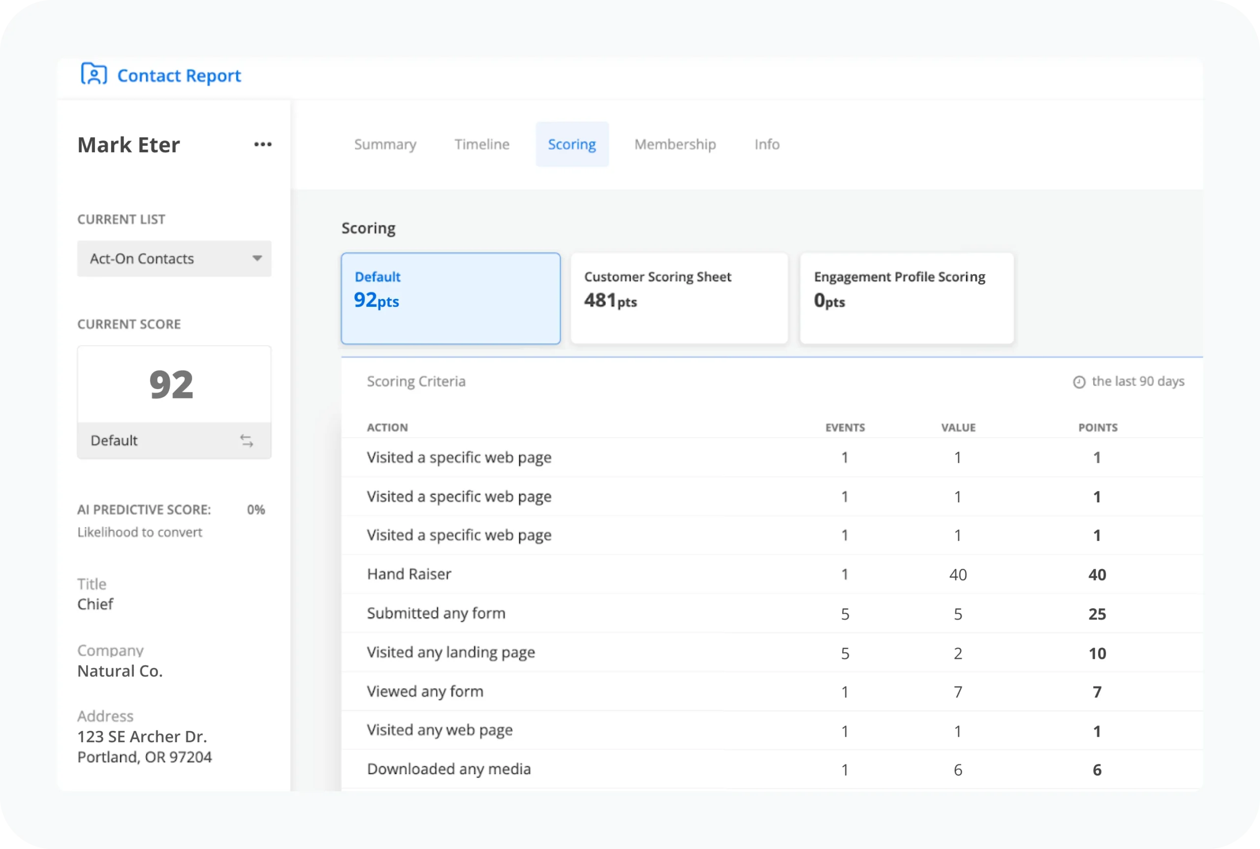 Act-On’s sophisticated yet easy-to-use, lead scoring model identifies when leads go beyond kicking the tires, and