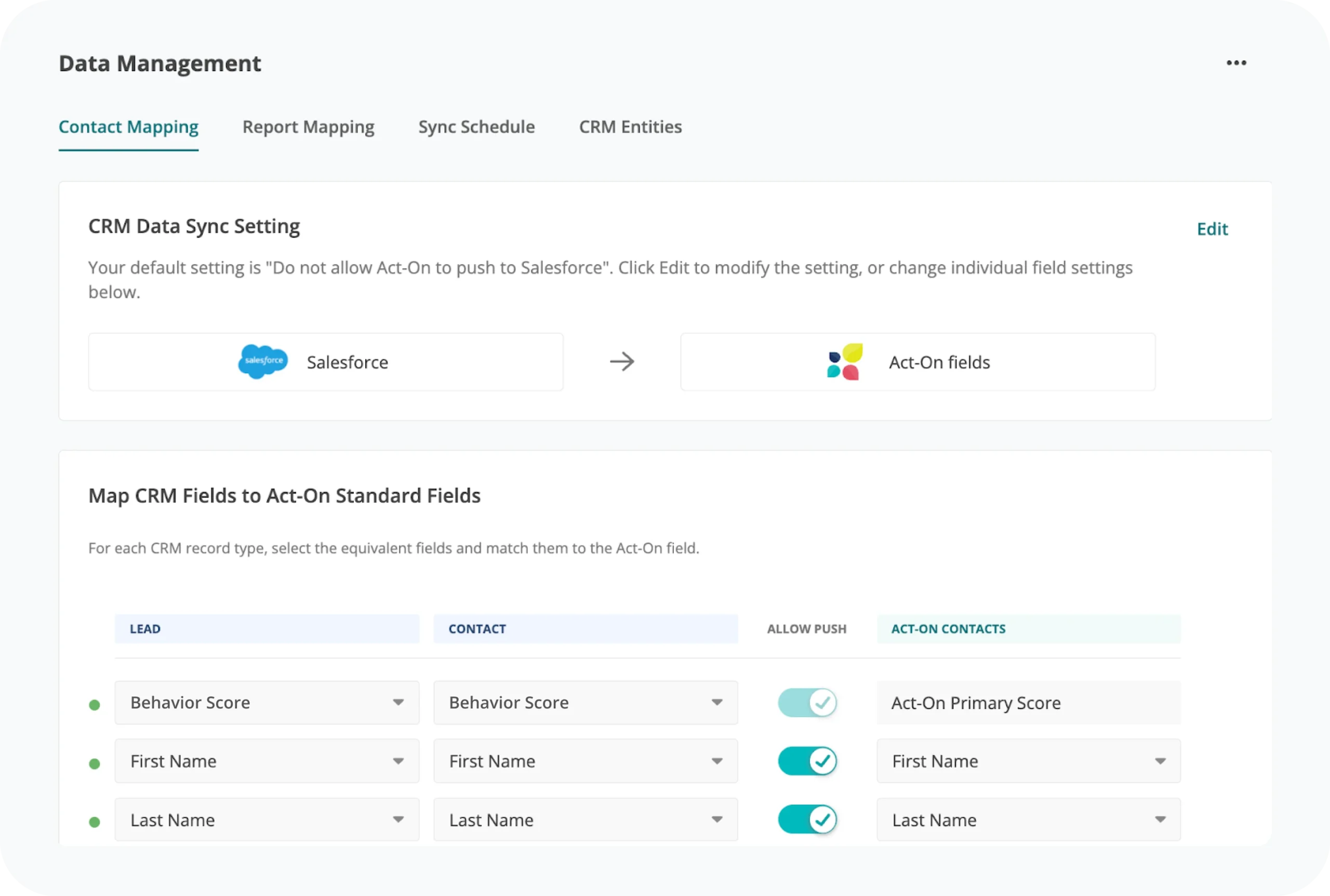Act-On has the industry’s best integration with most CRM systems. Provide sales with the information they need, in the systems they live in the most. Sales teams can track hot prospects activity, follow up on tasks, dive into lead and account activity history, or send emails tracked by Act-On directly from their CRM.